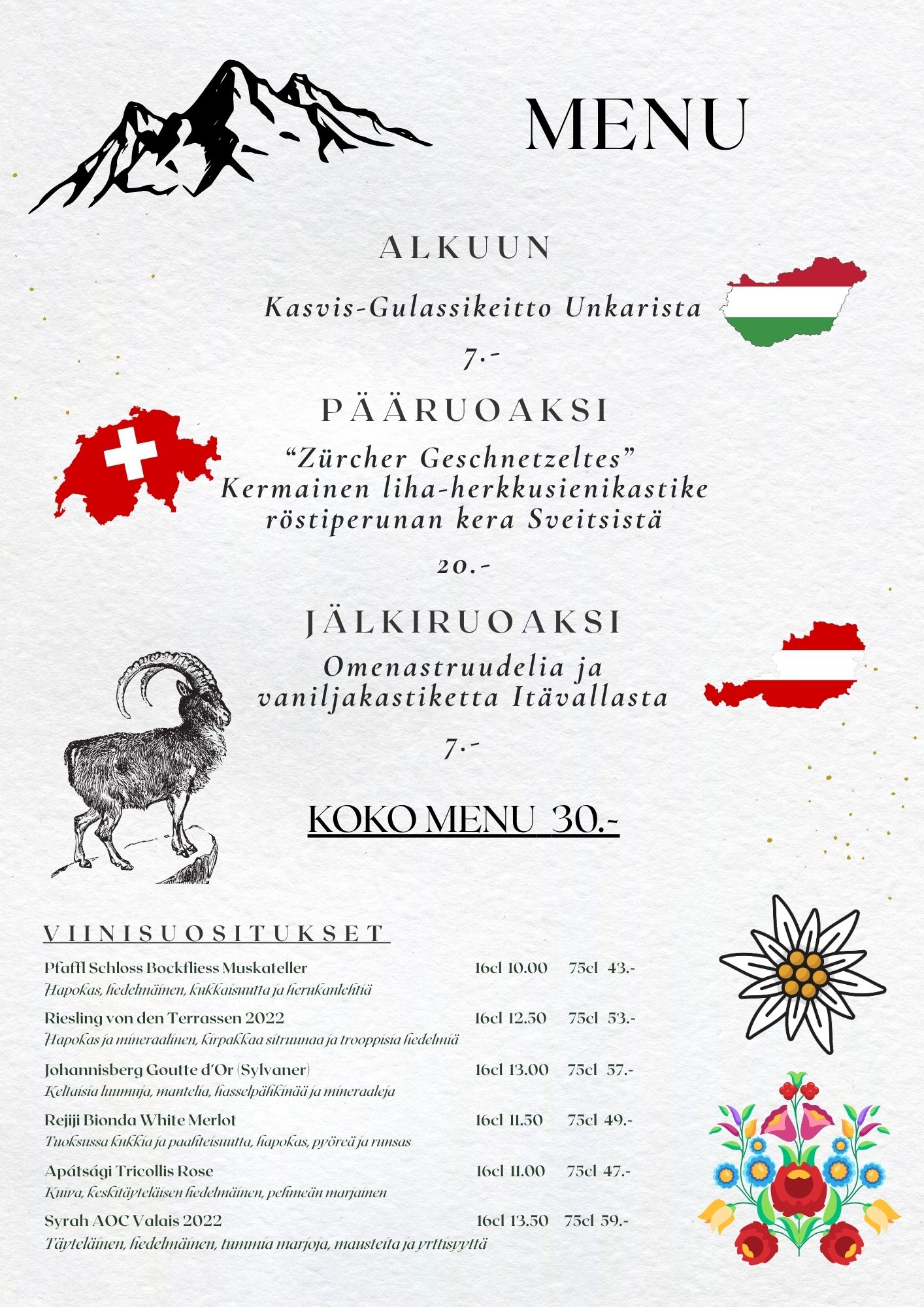 Hinta € 45.- muille kuin Viiniklubin kausikortin lunastaneille. Sisältää 8 viiniä à 6cl ja 1 kokonaisen flammin (8 erilaista jaettavana) per hlö.